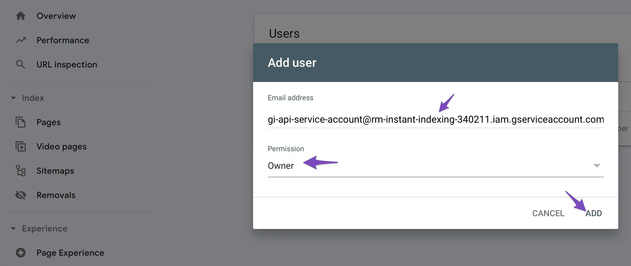 - menambahkan email service account ke Google Search Console,