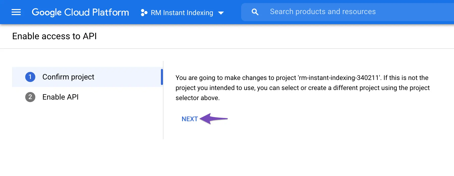- Pilih layanan Indexing API.