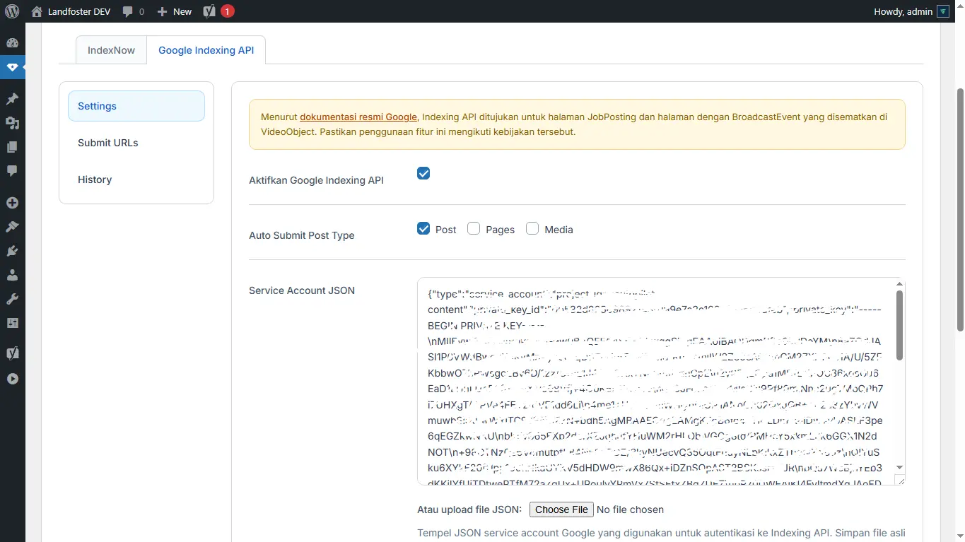 Jika langkah ini dilewati, plugin biasanya akan gagal saat mencoba mengirim URL ke Google Indexing API.