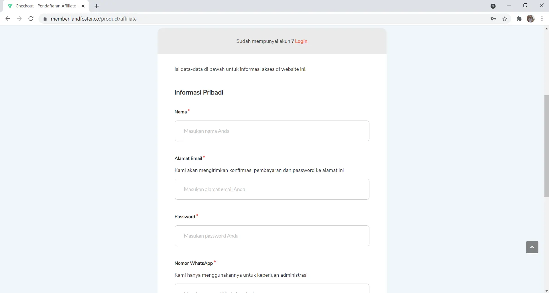 Langkah pertama adalah mengunjungi link pendaftaran resmi Landfoster: https://member.landfoster.id/product/affiliate