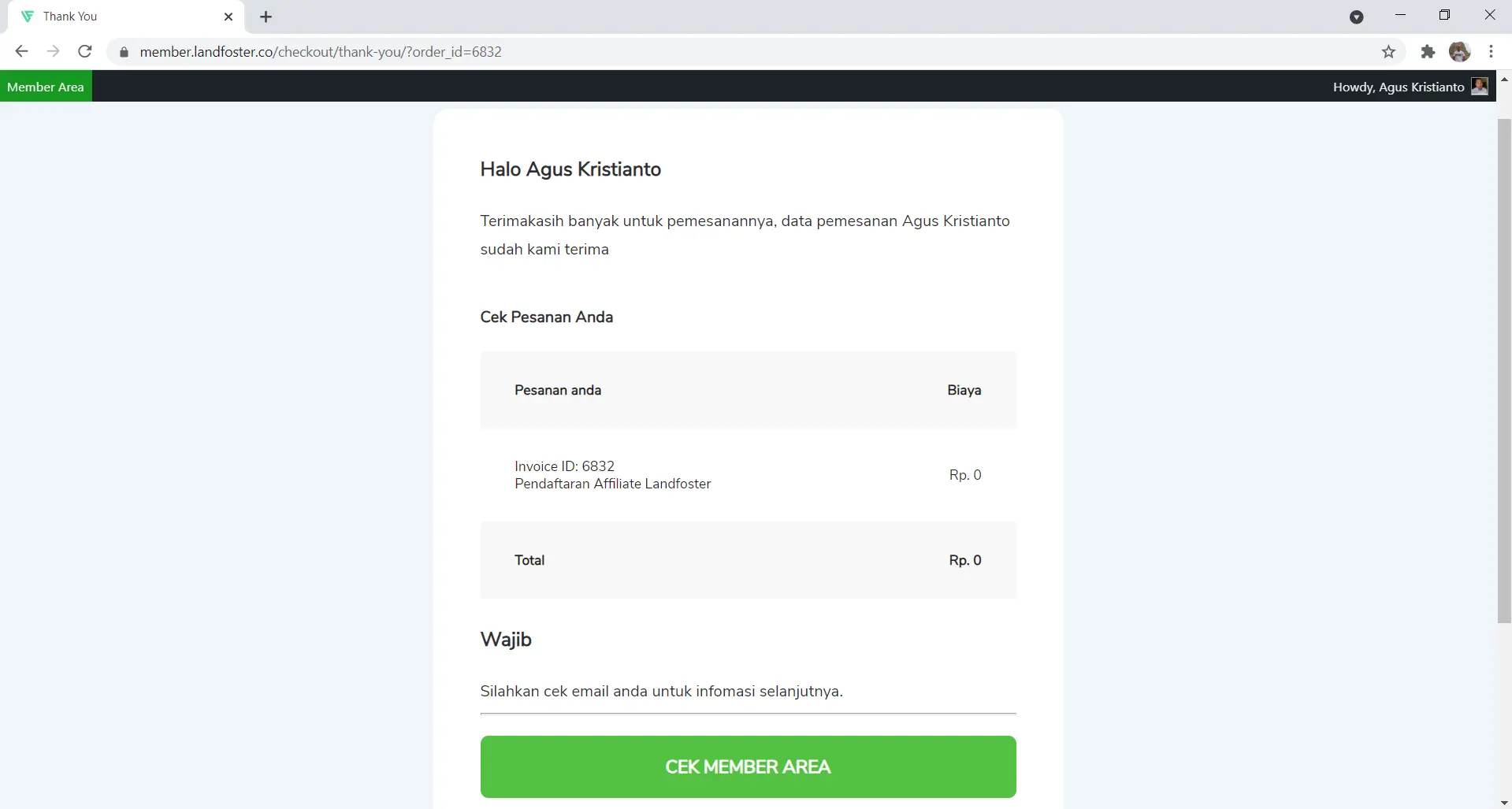 Jika semua data sudah diisi, Anda akan menerima pemberitahuan bahwa pendaftaran sebagai affiliate berhasil. Pada tahap ini, klik tombol CEK MEMBER AREA untuk melanjutkan proses.