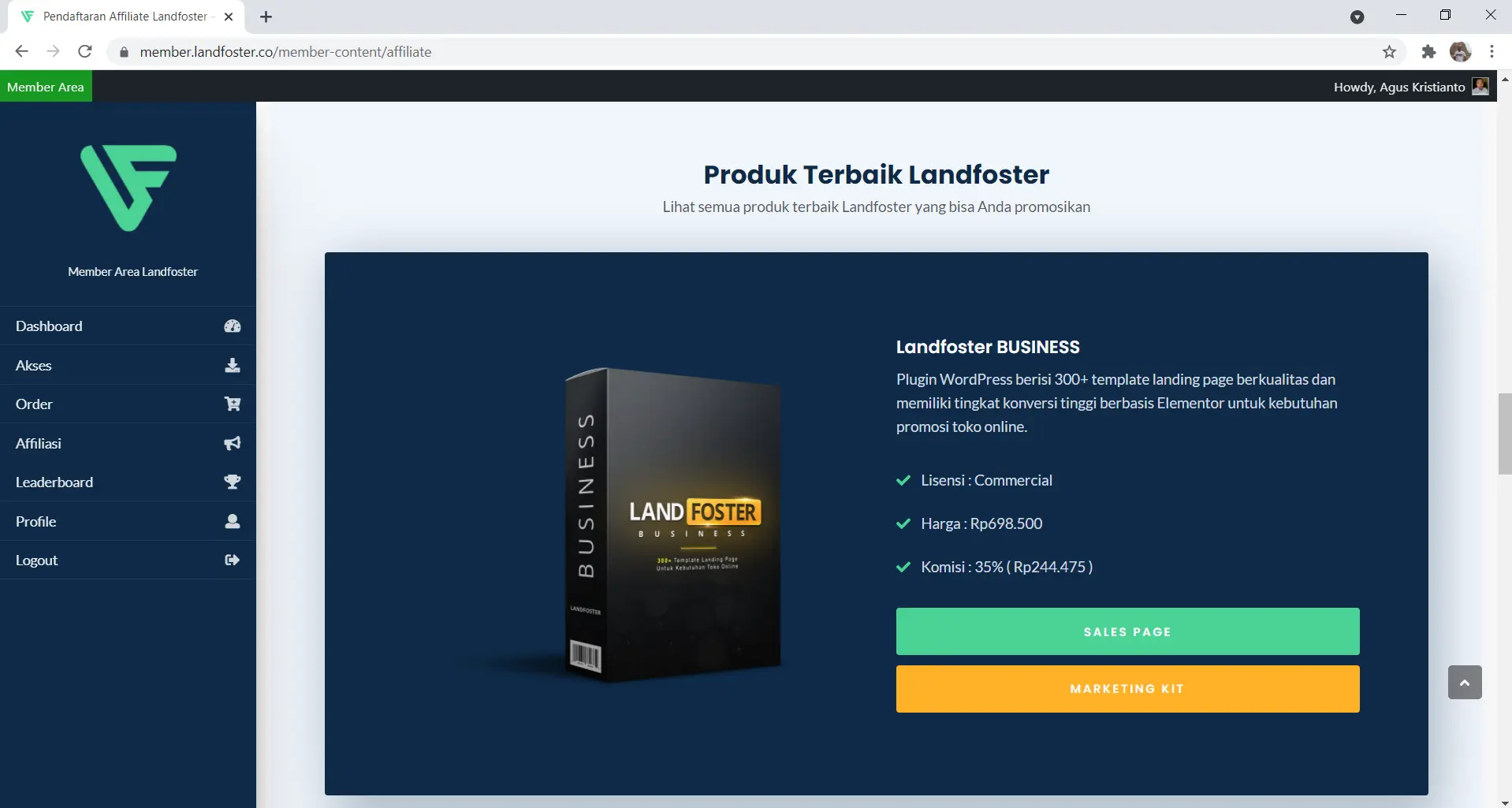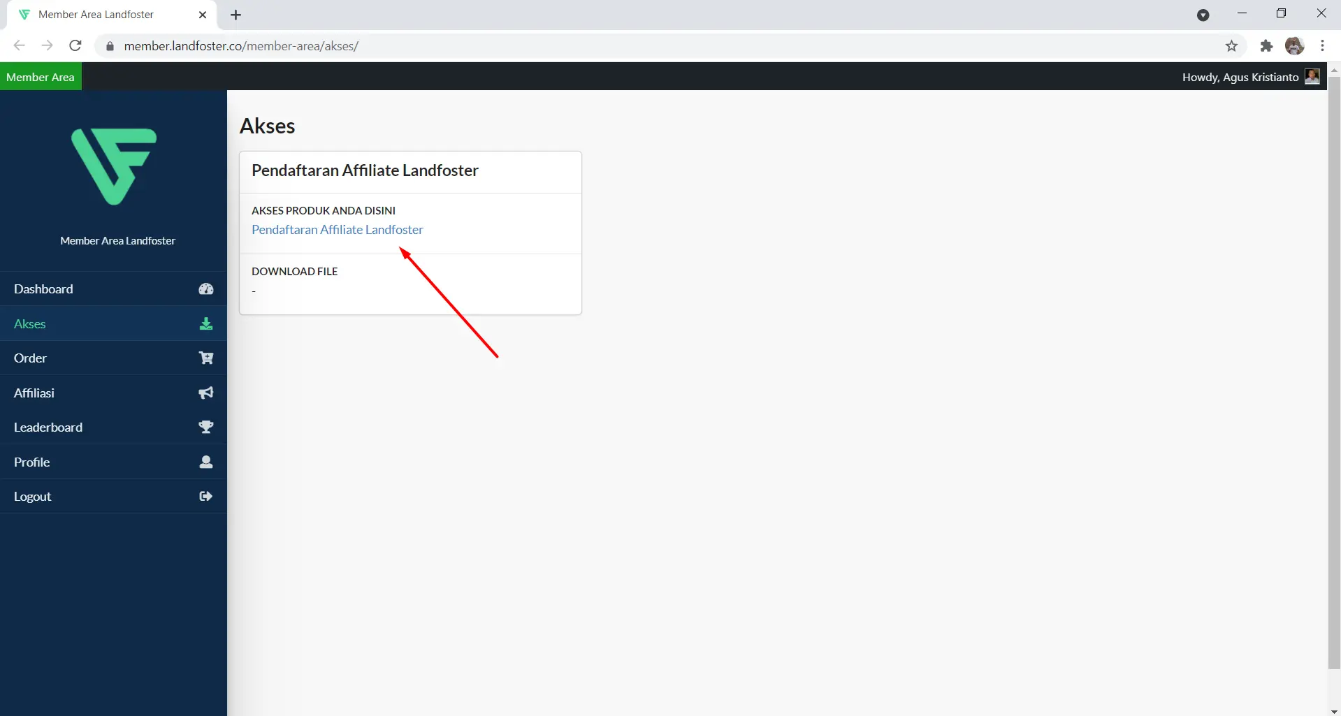 Anda kemudian akan diarahkan ke halaman akses Member Area. Di halaman ini, klik link berwarna biru untuk mendapatkan informasi lengkap mengenai program afiliasi Landfoster. Termasuk di dalamnya adalah marketing kit yang siap digunakan untuk kebutuhan promosi.